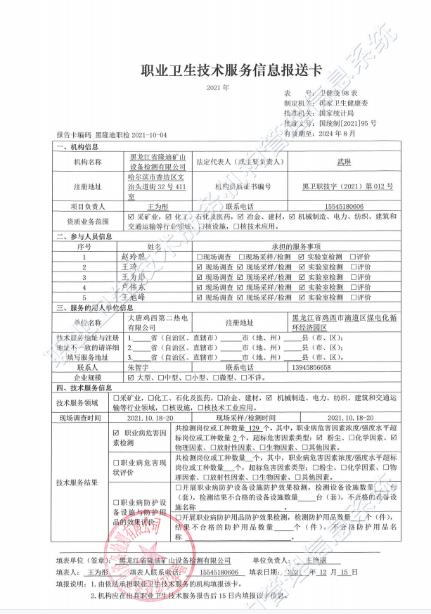 2021大唐雞西第二熱電有限公司職業(yè)病危害定期檢測